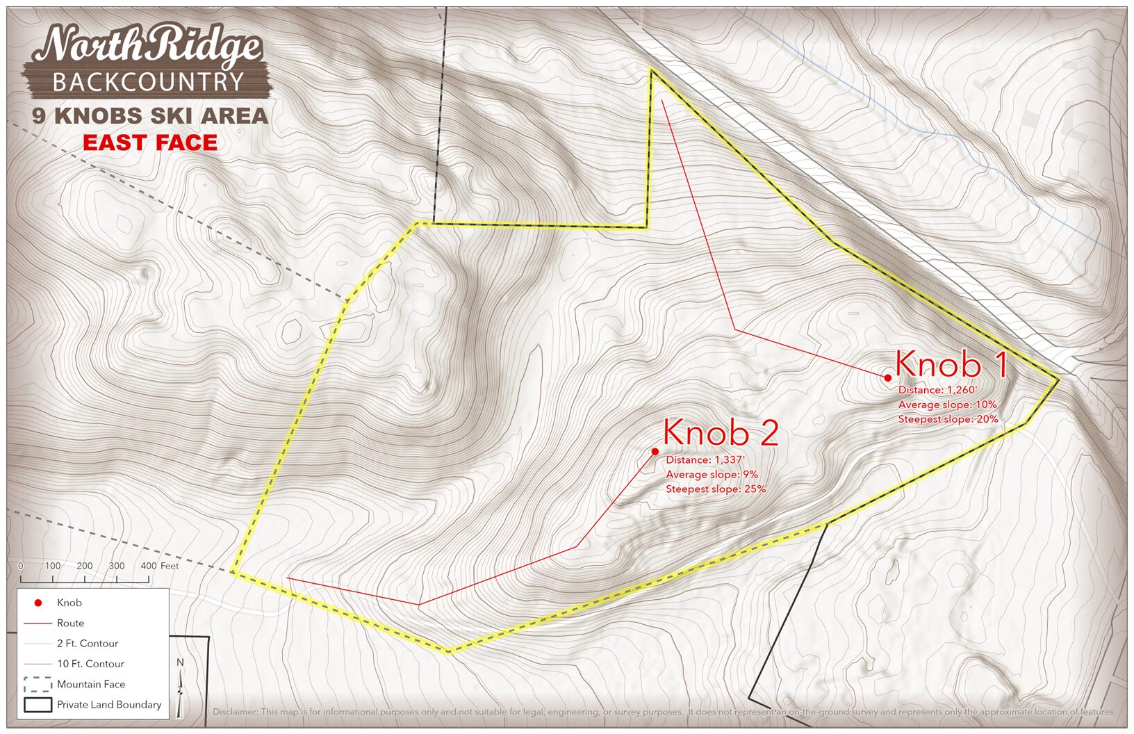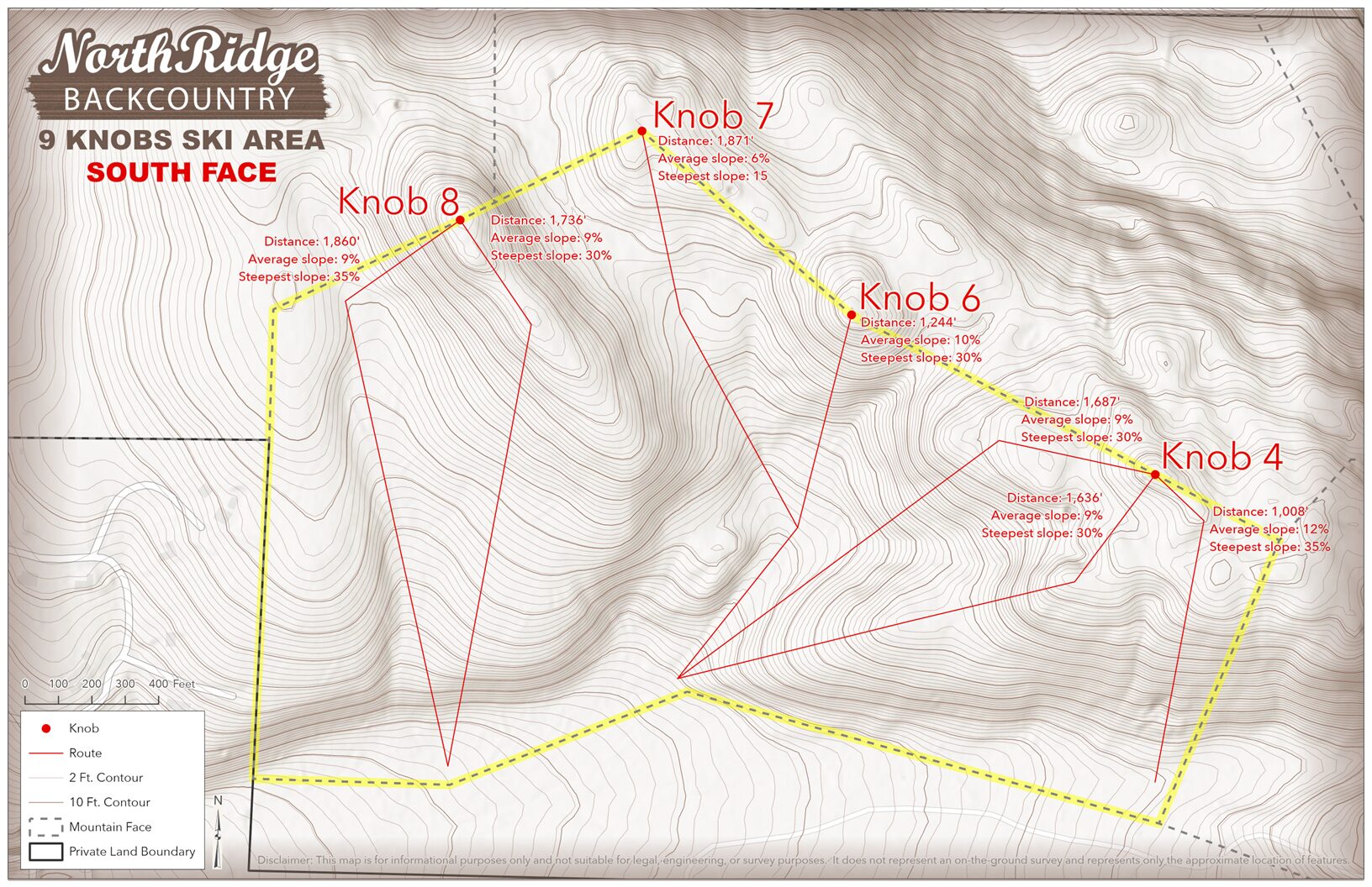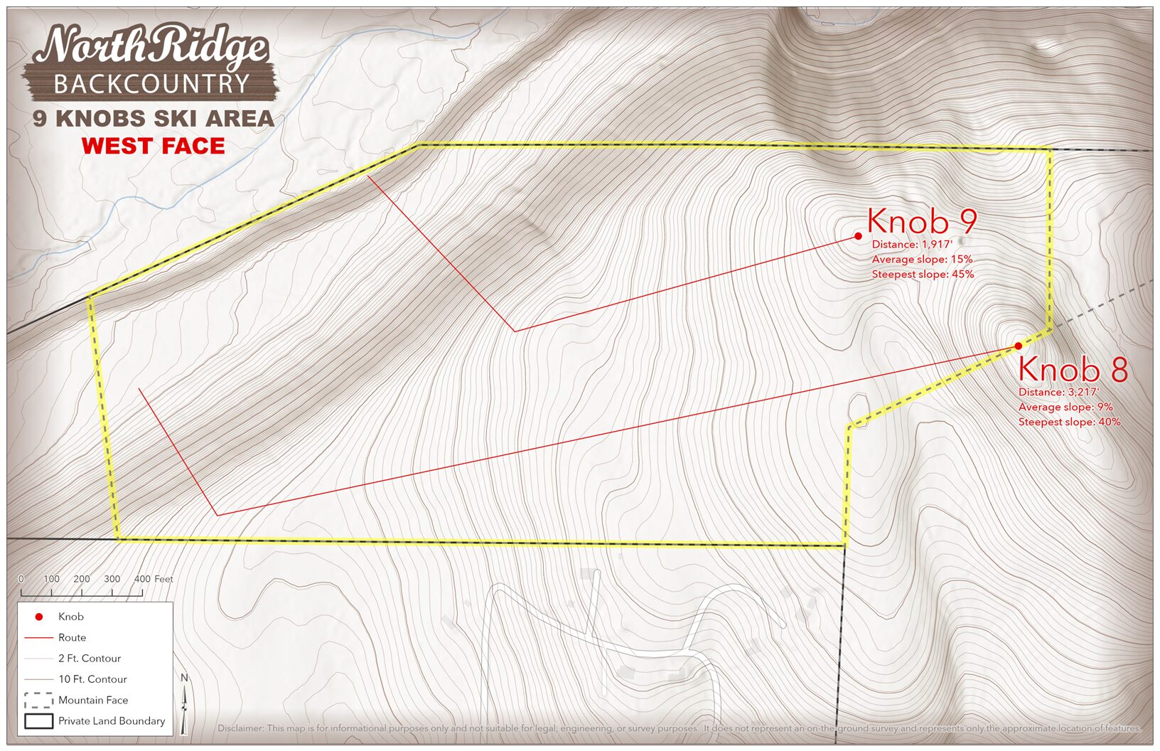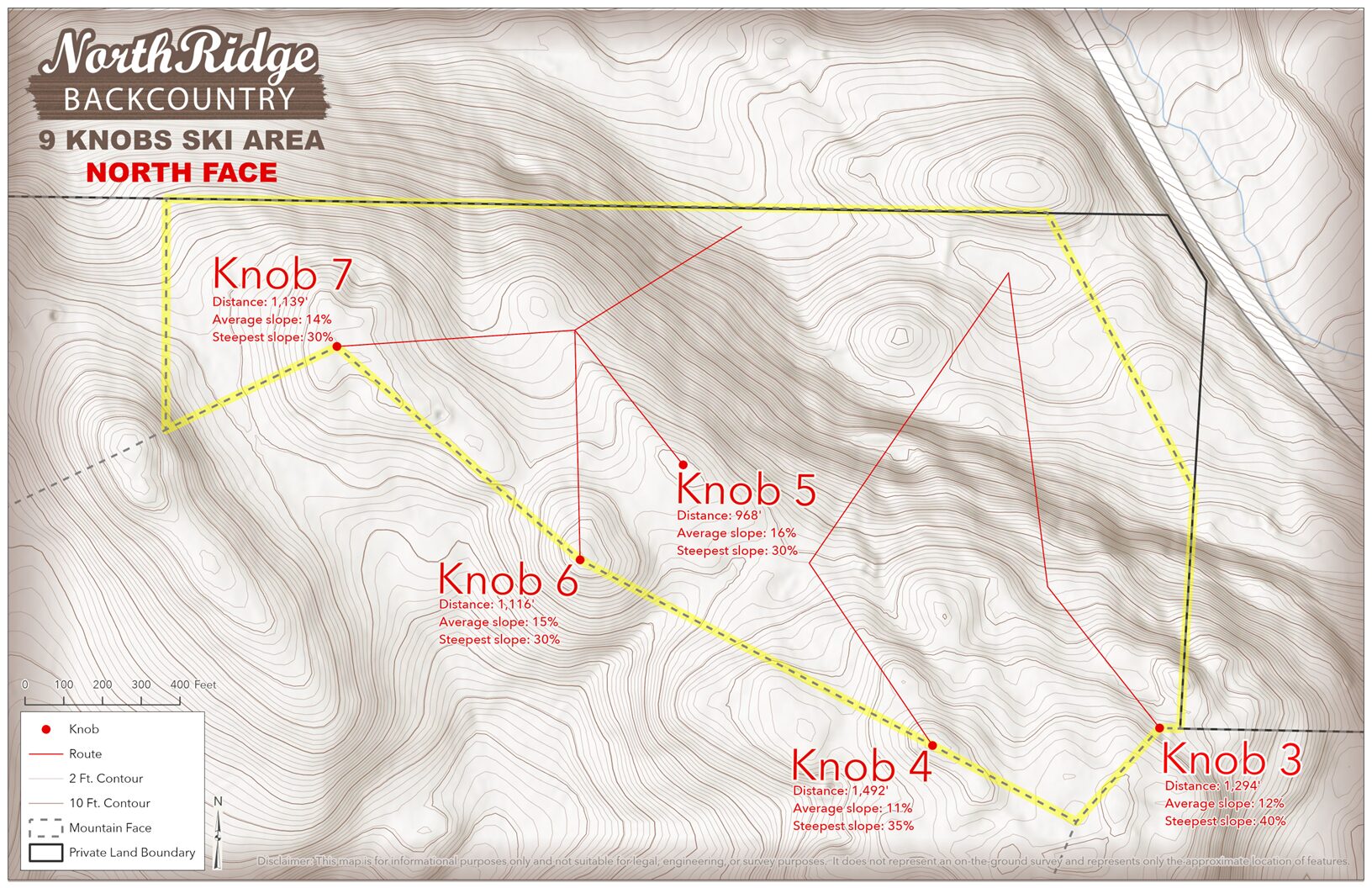 9 Knobs Backcountry Ski Trail If you love nature and can ski, skiing the trees has got to be one of your favorite things to do. NorthRidge Backcountry Ski Area will help you satisfy that need. The ridge itself is a mile long, with a flat top punctuated by 9 knobs that project skyward, giving nice starting points for your run downhill through the trees. These knobs give this skiing experience its name: the 9 Knobs Backcountry Ski Area.